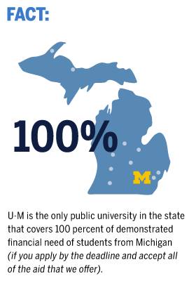 UM is the only public university in Michigan to cover 100 percent of demonstrated financial need of in-state students, and this can make it the most affordable of choices for students from the Shiawassee region. This process can be long and at times confusing, but we have been through it many times and can help you sort it all out.